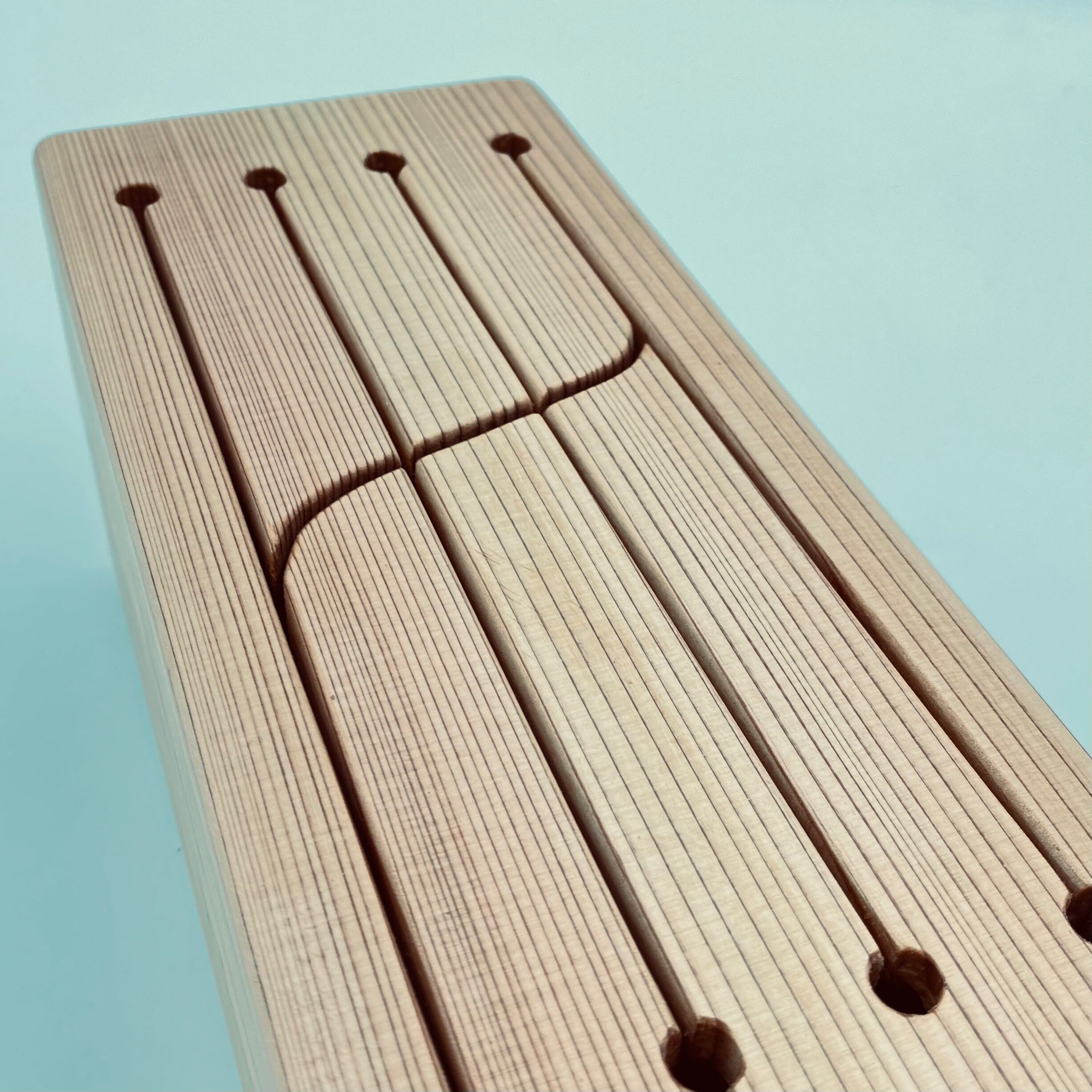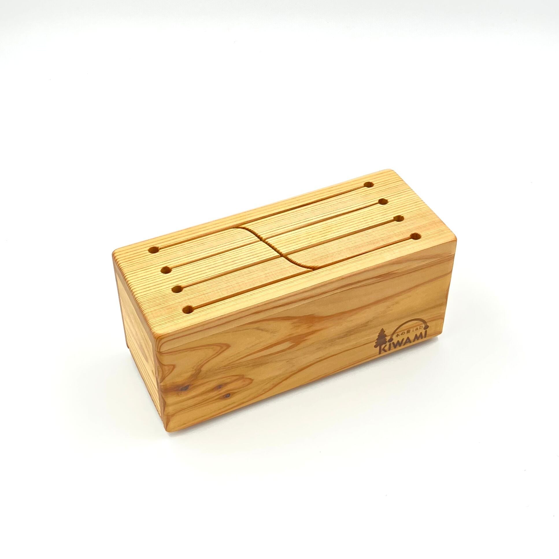 「スギットドラム」は、奈良県産の吉野杉を天板に使用した、手のひらサイズの木製スリットドラム。
